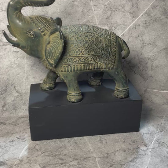 Finished with a natural vintage patina that brings out intricate details in the trunk, tusks, and body, giving it a collectible, antique look.