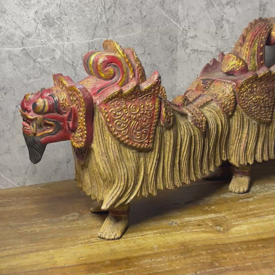 Bring the powerful presence of Balinese tradition into your space with Guardian Spirit — a striking hand-painted resin figure of the Barong, the mythical protector and symbol of good. With intricate detailing, bold colors, and a commanding posture, this piece radiates cultural richness and artistic craftsmanship.