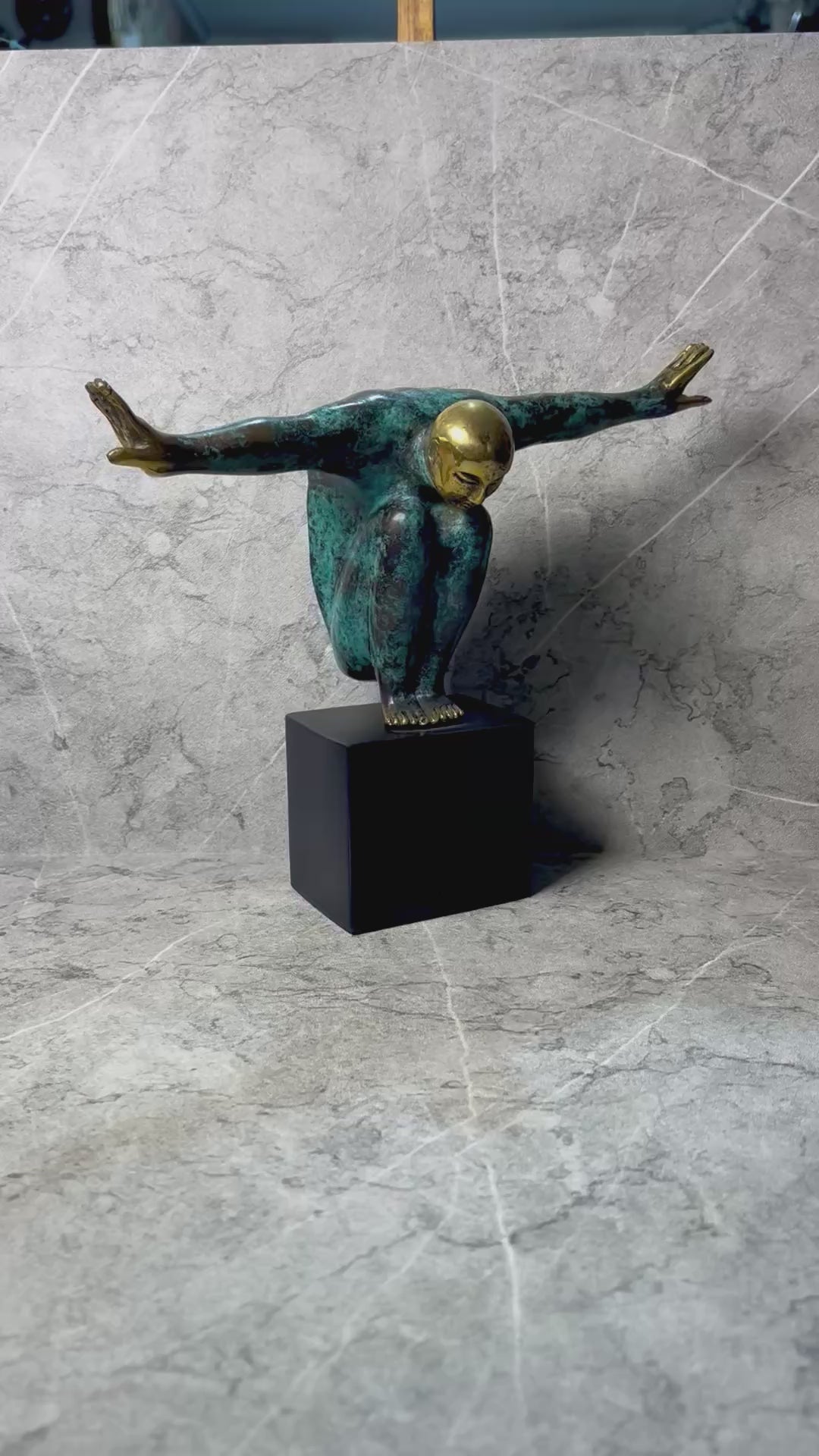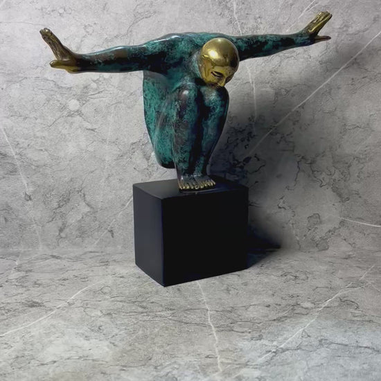 Capture a striking pause in time with Moment of Focus — a handcrafted bronze abstract figure depicting a poised dive or gesture of inward concentration. With its elongated form, outstretched arms, and burnished patina finish, this sculpture radiates balance, elegance, and intention. Mounted on a sleek black base, it serves as a powerful visual metaphor for presence, control, and determination.